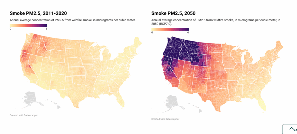 ووجد الباحثون أنه حتى لو خفض العالم الانبعاثات بسرعة كافية لتثبيت درجات الحرارة العالمية دون درجتين مئويتين بحلول نهاية القرن، فمن المرجح أن يتجاوز عدد الوفيات الناجمة عن التعرض للدخان الناجم عن تغير المناخ في الولايات المتحدة وحدها 60 ألف حالة وفاة سنوياً بحلول عام 2050.